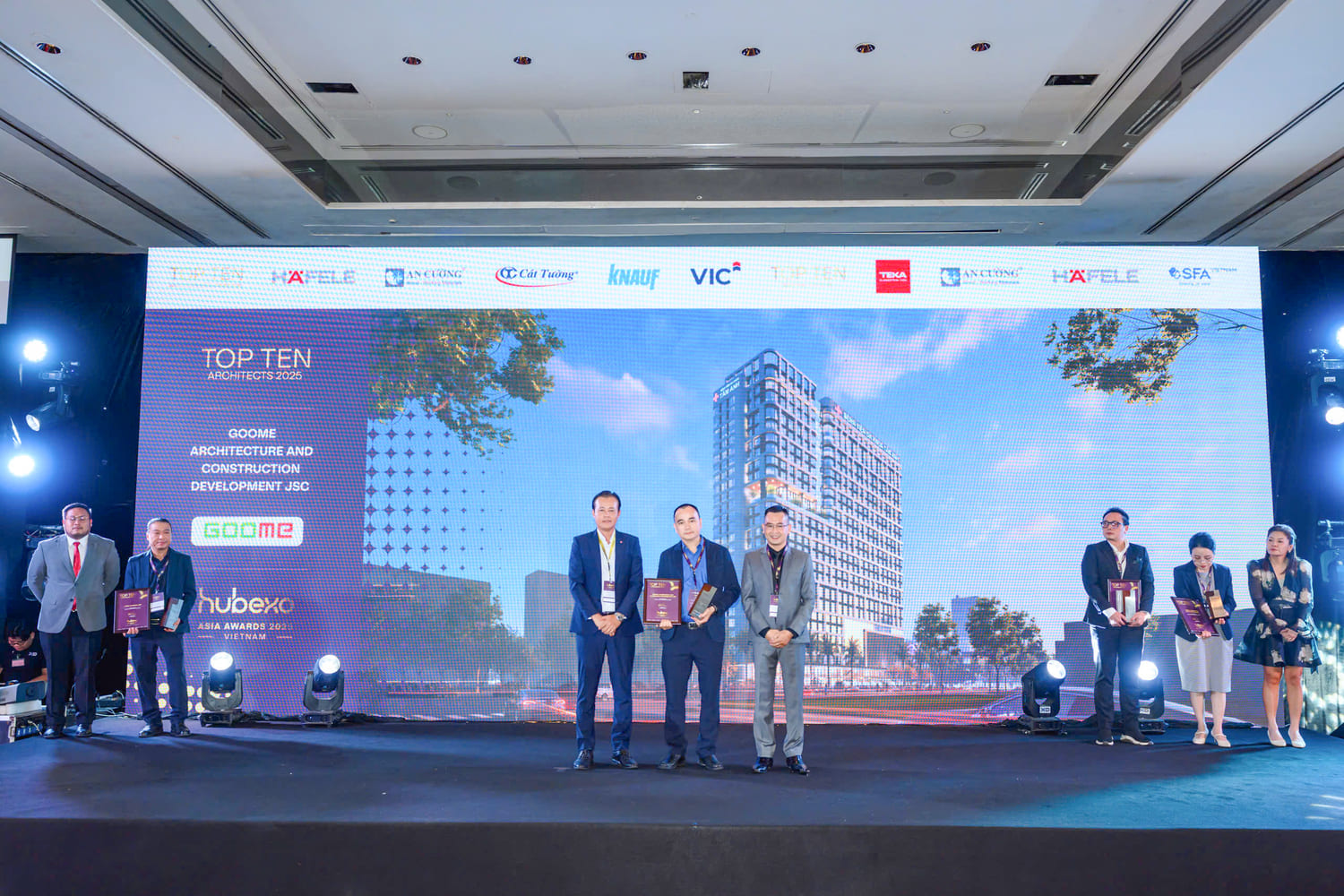 Goome tự hào được xướng tên trong “Top 10 Công ty Kiến trúc hàng đầu 2025” tại Hubexo Asia Awards – một trong những giải thưởng uy tín bậc nhất khu vực châu Á trong lĩnh vực kiến trúc – xây dựng.